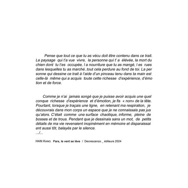 "Au gré du souffle…. Telle doit être la devise de l’artiste accompli, tous ses sens aux aguets dans la traque aux dix mille mouvements insensibles qui irriguent le grand corps du monde. Être à la fois au service du Yin et au service du Yang, ces deux forces qui se partagent l’univers : un principe féminin, appliqué à creuser les mystères de la substance, en refuge d’intimité : un principe masculin, haut dressé, revendiquant l’altitude."